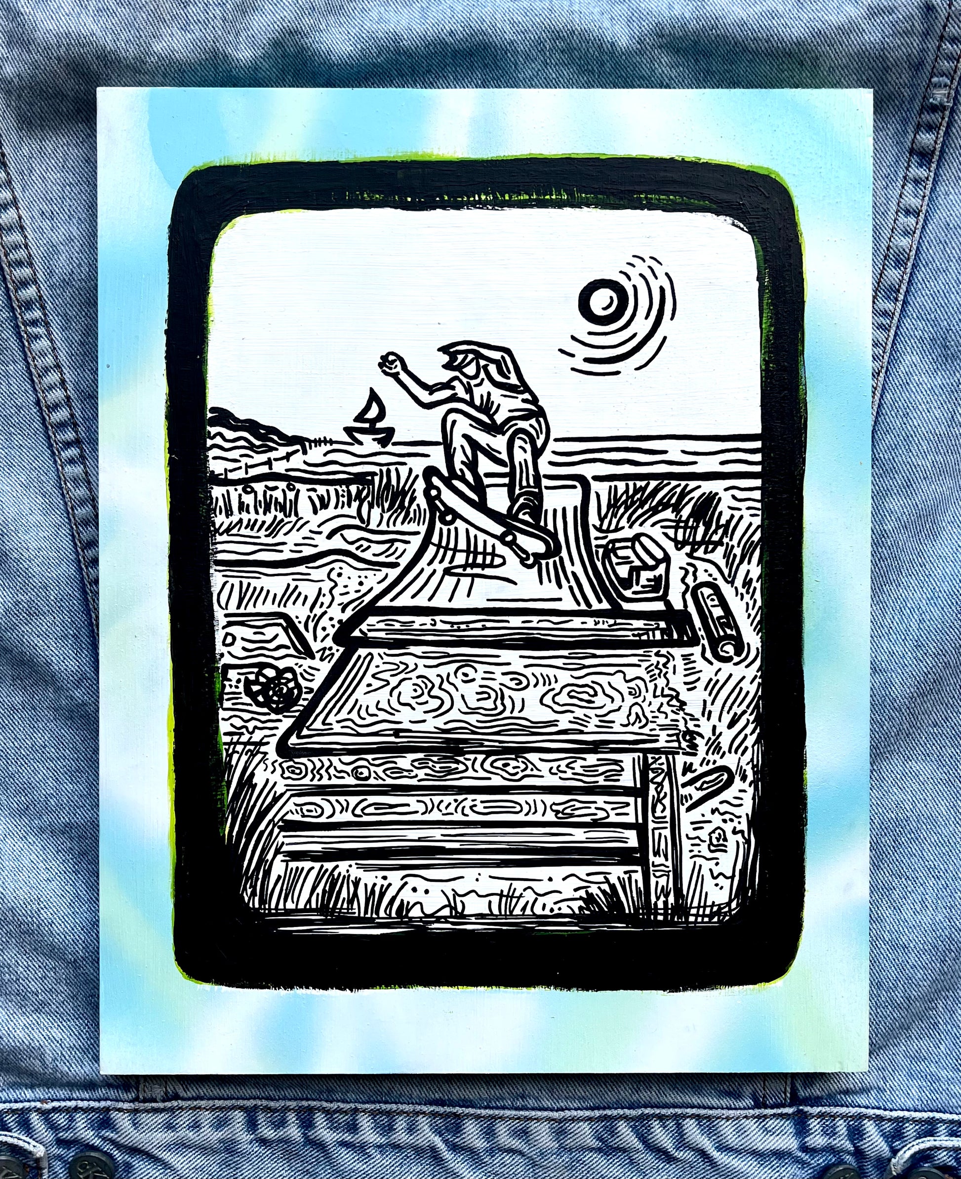 Mixed media on wood panel, 11"x14". Painting inspired by skateboarder at DIY spot at beach at Navy Road in Montauk, NY.