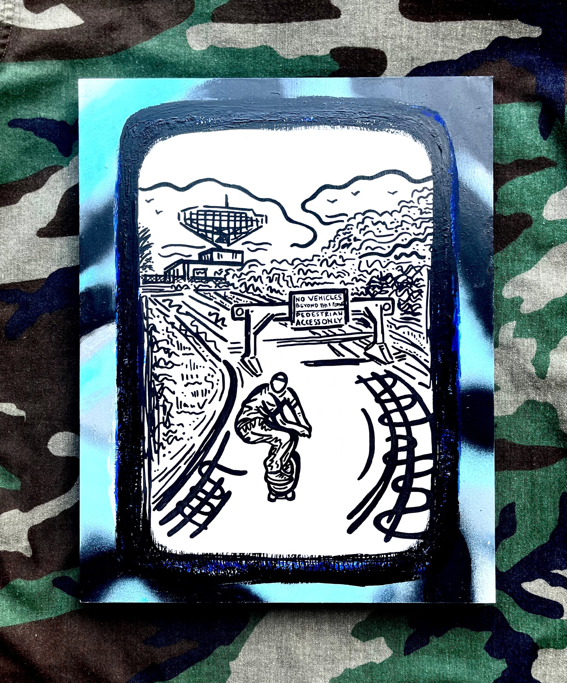 Mixed media on wood panel, 11"x14". Painting inspired by skateboarder at Montauk Radar Tower at Camp Hero State Park.